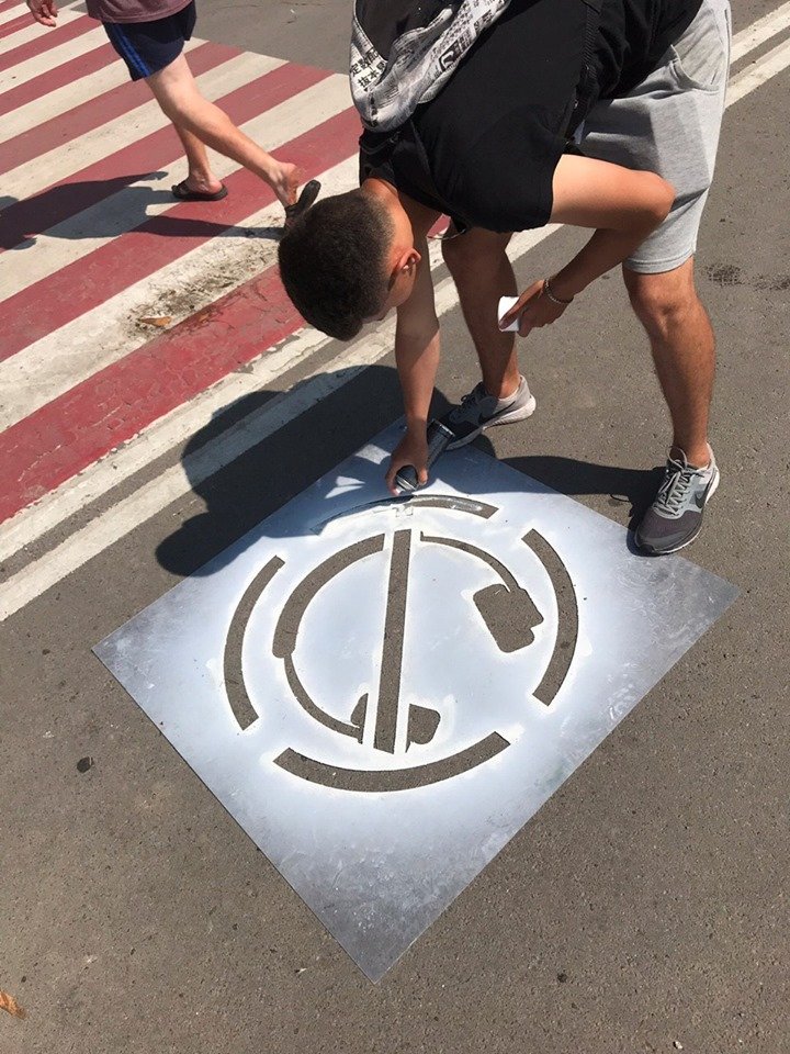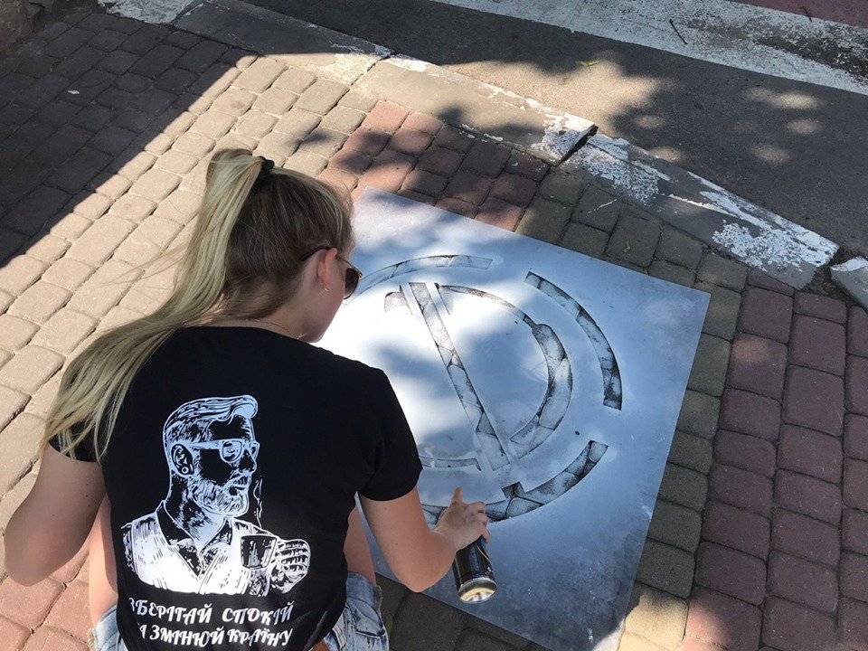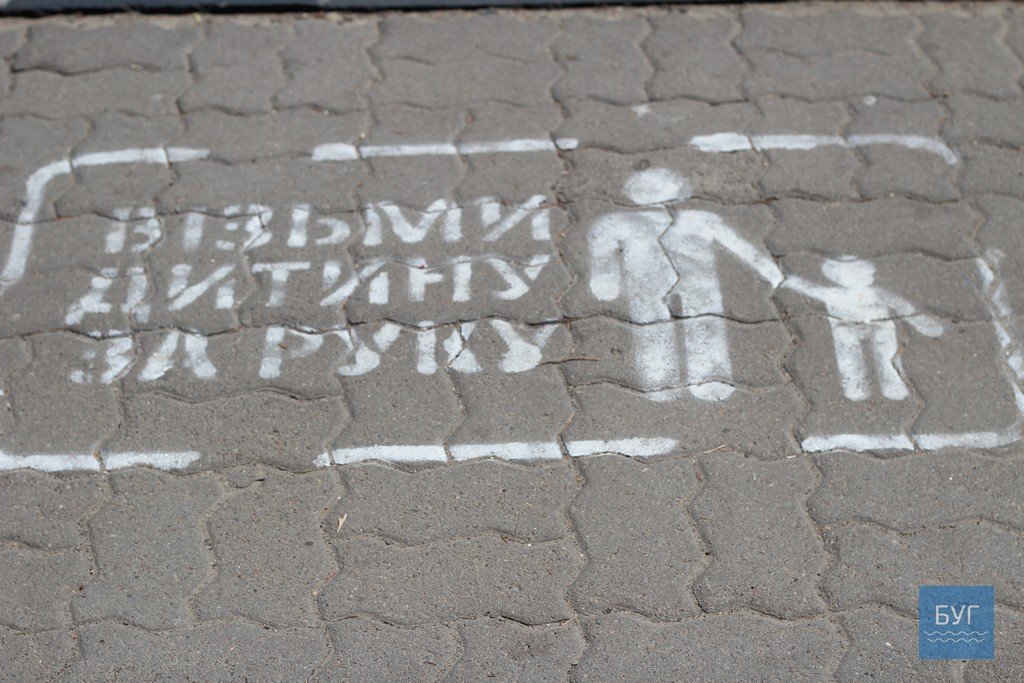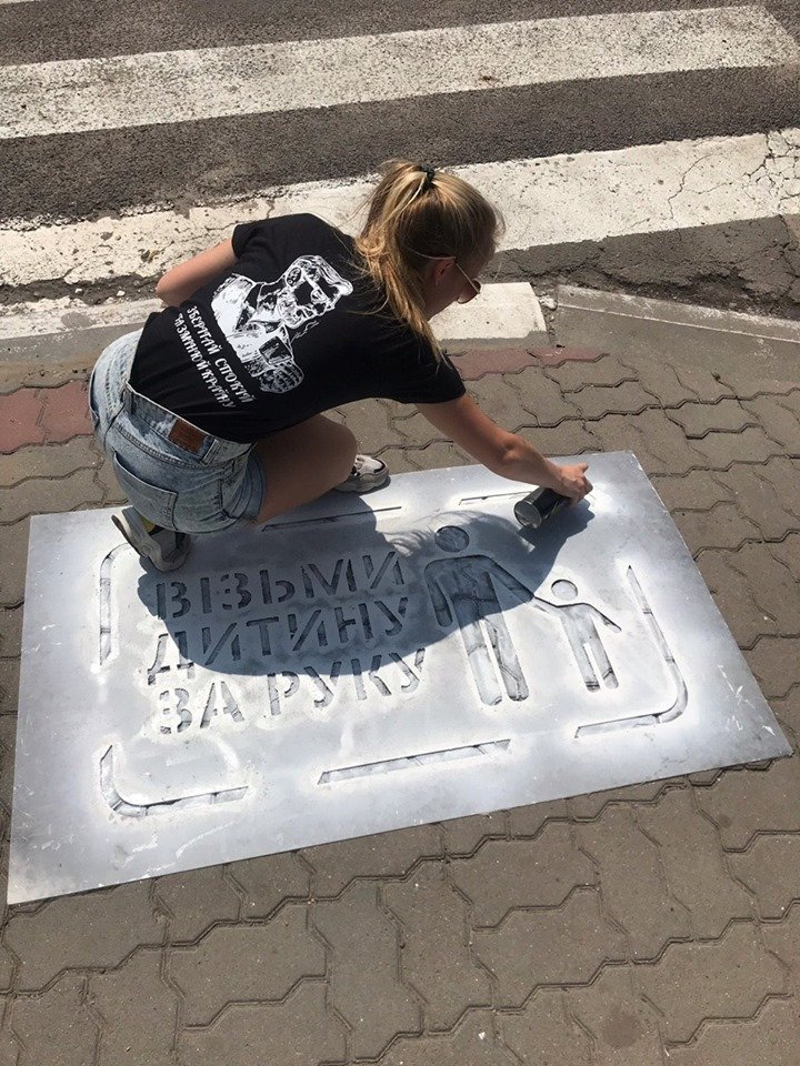 Команда молодіжного центру «Нові крила» та патрульна поліція Волинської області фарбою, з допомогою металевих трафаретів, нанесли написи та малюнки: «Подивись», «Візьми дитину на руки», «Прибери телефон та навушники».