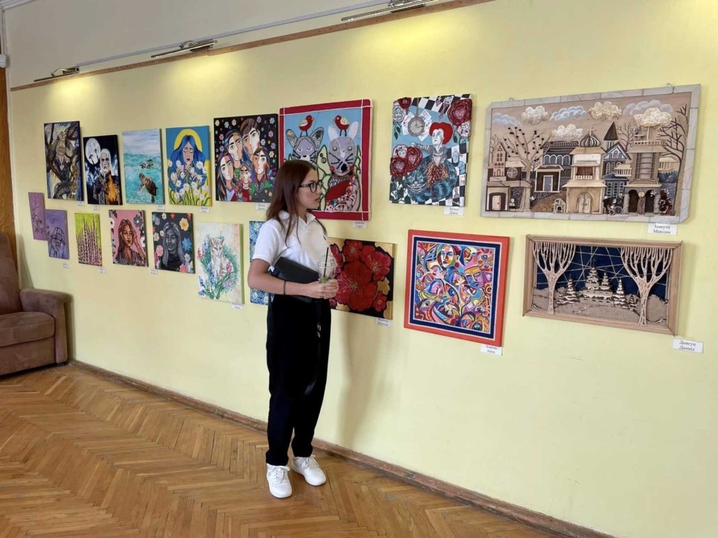 Випускники художнього відділу школи мистецтв коротко розповіли присутнім на виставці про ідеї, закладені у своїх роботах, техніку виконання, цікаві моменти з процесу виконання своїх творів.