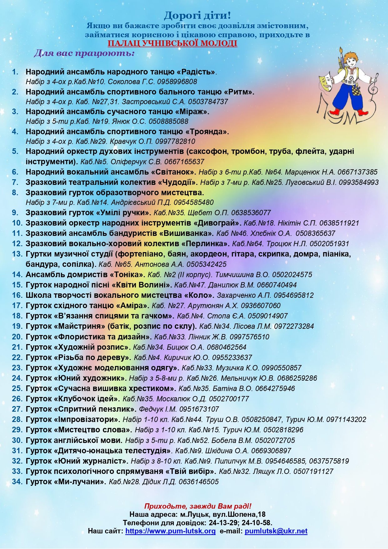 Нагородою талановитим артистам стали захват і аплодисменти численних глядачів свята, які із задоволенням стежили за концертом, робили фото і відео для соцмереж.У «мистецькому містечку» на майданчику біля Палацу запрошували школярів до гуртків відділу декоративно-ужиткової творчості та образотворчого мистецтва під керівництвом Оксани Щебет: дітям запропонували прикрасити різнокольоровими метеликами веселкову райдугу, а також показали роботи своїх вихованців.Навчальний рік в Палаці розпочинається і для вихованців з особливими освітніми потребами. Вже не перший рік працюють гуртки «Хореографія», «Анімація» та «Флористика і дизайн» для «сонячних» лучан.Поряд розмістили свої експозиції педагоги Центру науково-технічної творчості учнівської молоді для тих, кого цікавлять технічні напрямки - від цифрового фото до астрономії.Святковий захід проводили ведучі-початківці гуртка «Мистецтво слова» разом з її керівницею Юлією Турич, а знімкували і фільмували найемоційніші миті юні тележурналісти Дитячо-юнацької телестудії під керівництвом Ольги Шкідини. Також працював онлайн-запис до гуртка «Юний журналіст» арт-журналістки Марії Пилипчук для охочих вивчати інтернет-журналістику.У цей день до колективів і гуртків ПУМу записалися усі охочі гості свята. Багато батьків та дітей взяли інформаційні флаєри з контактами керівників, щоб обдумати та обрати собі заняття до душі, адже запис триватиме до кінця вересня і шанс потрапити до омріяного гуртка є у кожного. Палац учнівської молоді гостинно відкриває двері для юних талантів – приходьте і станьте учасниками великої родини. «Палац – наш дім – ми господарі в нім»!Марія ПИЛИПЧУК