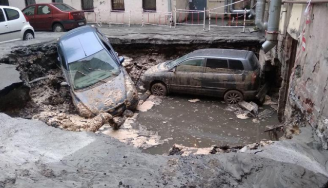 У результаті прориву труби під асфальт провалилися два автомобілі, окріп почав затікати в підвальне кафе поряд з місцем події.