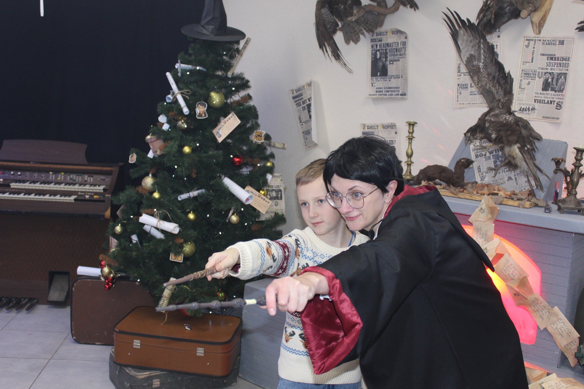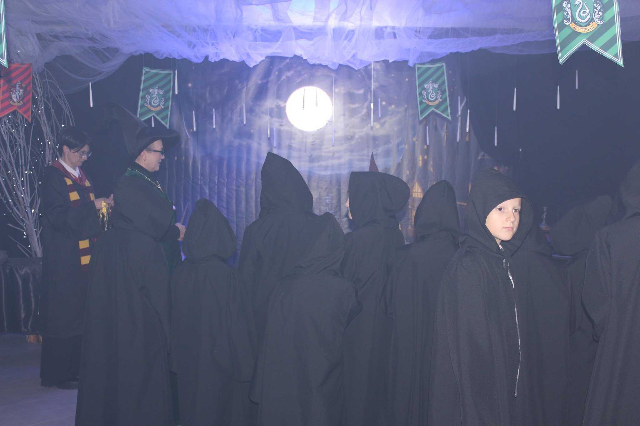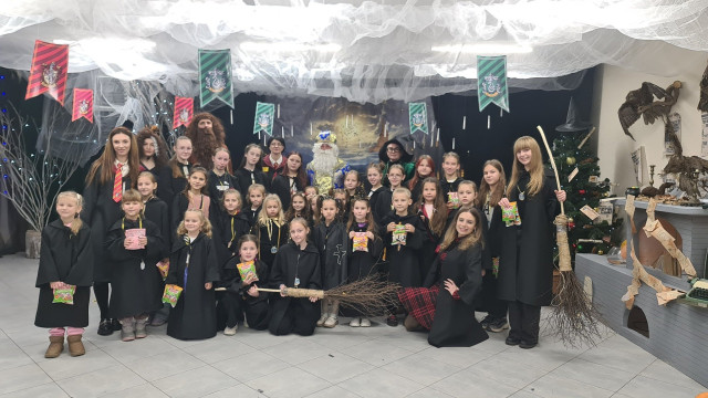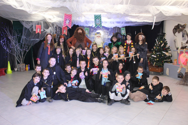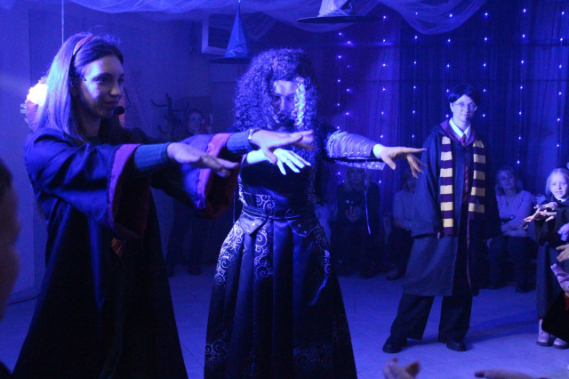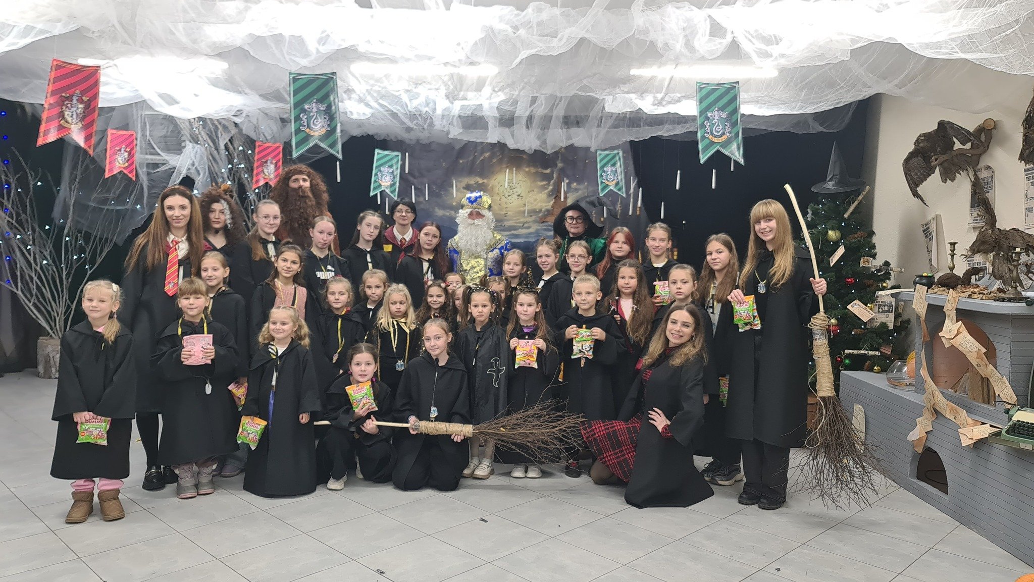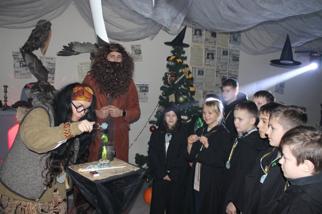 Окрім активних розваг і танців, діти відвідують лекції професорки Трелоні, яка викладає курс віщувань і передбачень, вчаться законів левітації та чарівних заклинань, якими разом із Гаррі Поттером запалюють летючі вогні.Віщунка Трелоні навіть передбачає дітям можливу зустріч із темним чарівником Лордом Волдемортом, який живе в підземеллях Гоґвортсу. Але разом із дітьми вона змінює перебіг подій, задіюючи магію, аби знищити темні сили та зустріти доброго чарівника – Святого Миколая.І хоч віддана соратниця Волдеморта Белатриса намагається зачарувати дітей, вони захищають Гаррі, долають стихію зі сріблястого паперового снігу та перемагають злого чаклуна. Діти знаходять чарівне закляття та звільняють Святого Миколая, який приходить до них із подарунками.Майстерклас для «студентів» Гоґвортсу теж був тематичним: кожен розмалював фігурку сови. У Гоґвортсі сова є символом мудрості, знань, дружби та відданості. Адже полярна сова Гедвіґа, яку Гаррі Поттеру на 11-річчя подарував Геґрід, була його вірною супутницею і доставляла листи від друзів зі школи чарівників.Відтепер близько тисячі дітлахів із сіл Підгайцівської громади та Луцька, які відвідали Майстерню Святого Миколая, матимуть своїх чарівних сов, що нагадуватимуть їм про неймовірне свято, яке подарувало щирий захват і зміцнило віру в те, що добро перемагає зло.