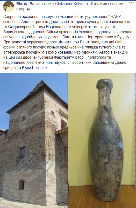 «Охоронна археологічна служба України Інституту археології НАНУ спільно із адміністрацією Державного історико-культурного заповідника та Східноєвропейським національним університетом за участі Волинського відділення Спілки археологів України продовжує попереднє вивчення віднайдених підземель Башти князів Чарторийських у Луцьку.