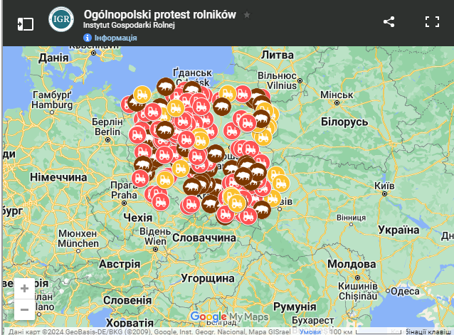 Ось мапа протестів. Тракторами на ній позначені протести фермерів, а кабанами – мисливців.Реакція України