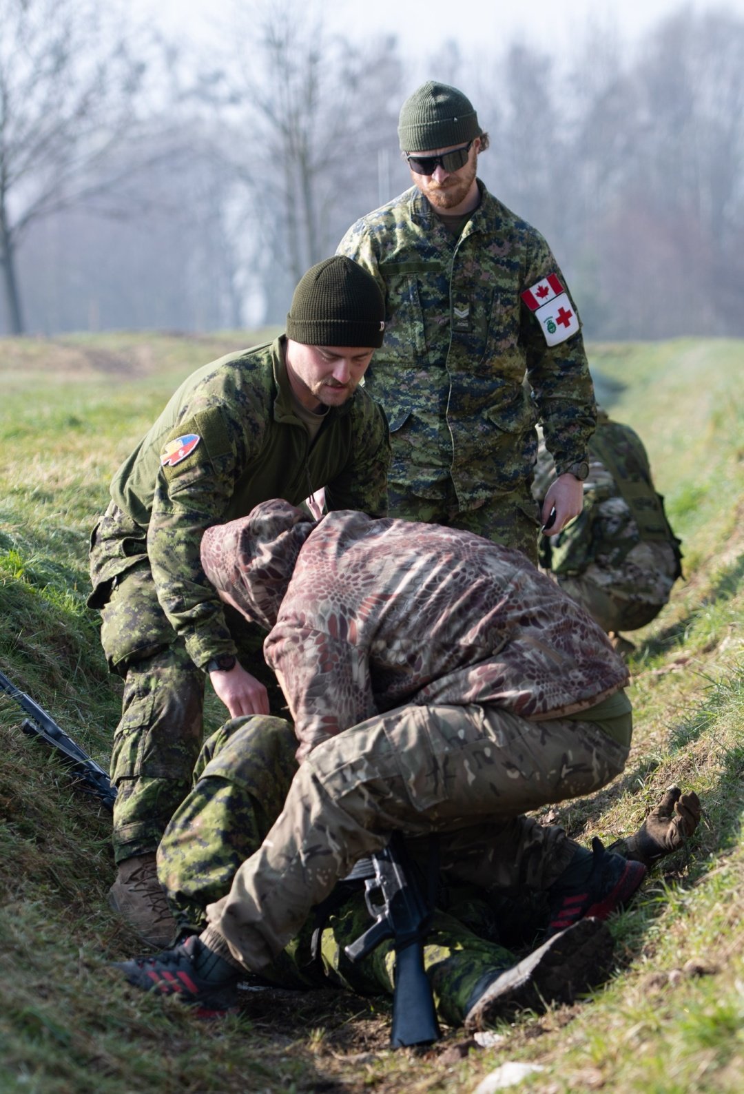 «Військовослужбовці Збройних сил України проходять спеціалізовану бойову медичну підготовку – навчання згідно з стандартом «Тактична допомога пораненим в умовах бойових дій» під керівництвом комбат-медиків інструкторів та інструкторок з Збройних сил Канади, Великої Британії та Польщі на території Республіки Польща в рамках навчальної операції Збройних сил Канади Unifier та за підтримки операції Орбітал ЗС Великої Британії», – ідеться у повідомленні.