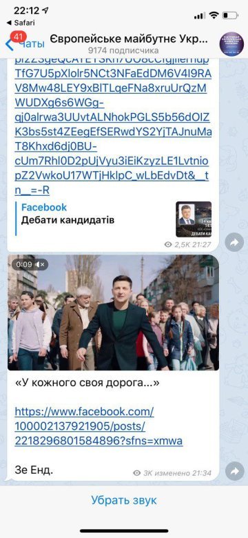 Ще раніше у Фейсбук гарант закликав приєднуватися до нього, а на ролику і в описі до публікації є посилання на його новий сайт euua.org.Після реєстрації на сайті миттєво приходить СМС, що містить посилання на Telegram та Viber-канали.У зазначеному Telegram-каналі опублікували відеоролик з вирізкою з реклами Зеленського. За допомогою монтажу додали, що його збиває фура. На опублікованому командою Порошенка відео видно, як Зеленського збиває російська вантажівка КамАЗ – авто тієї ж марки, яке спричинило смертельну ДТП, в якій загинув Герой України, кандидат в Президенти України В'ячеслав Чорновіл.«Не зрозуміло, Петро Олексійович насолоджується кадром, як фура збиває Володимира Зеленського, чи може він отримує задоволення від білої доріжки, яка з’являється після..», – прокоментували в команді Зеленського та додали, що рекомендують кандидату посилити охорону.