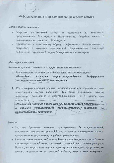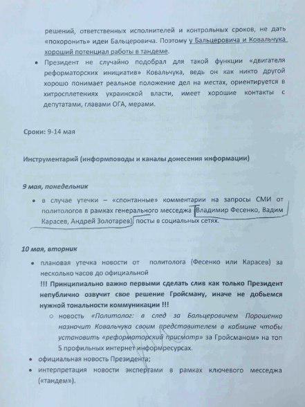 Один із документів деталізував інформаційну кампанію, яка мала супроводжувати призначення Віталія Ковальчука представником президента в Кабміні у травні 2016 року.Згідно з ним, планували спочатку «злити» інформацію про призначення через лояльних політологів – Володимира Фесенка, Вадима Карасьова та Андрія Золотарьова, які мали б позитивно прокоментувати фігуру Ковальчука.