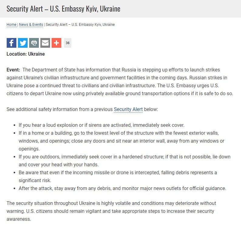 «Держдепартамент володіє інформацією, що Росія нарощує зусилля для завдання ударів по цивільній інфраструктурі України та урядових об’єктах найближчими днями. Російські удари по Україні становлять постійну загрозу для мирних жителів та цивільної інфраструктури. Посольство США закликає американських громадян покинути Україну зараз, використовуючи доступні приватні варіанти наземного транспорту, якщо це безпечно», – йдеться в заяві.Reuters вже писало, США мають розвіддані про те, що Росія планує найближчим часом завдати нових ударів по цивільній інфраструктурі і державних об'єктах України.Додамо, востаннє Сполучені Штати Америки закликали своїх громадян не в'їжджати в Україну 14 липня, після атаки на Вінницю.