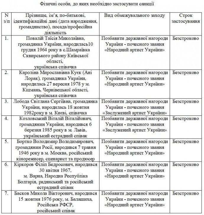 Група депутатів у проекті постанови №9156 пропонує позбавити українських співачок Таїсію Повалій та Ані Лорак звань народних артисток, а Світлану Лободу й Віталія Козловського – звань заслужених артистів України.