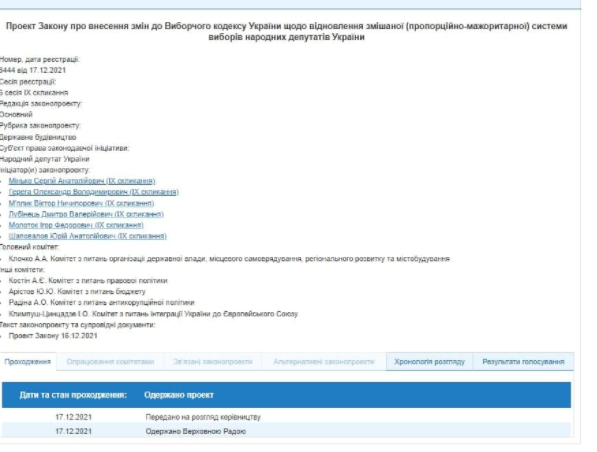 У Верховній Раді зареєстрували законопроект № 6444 щодо проведення наступних виборів за змішаною (пропорційно-мажоритарною) системою. Документ вносить відповідні зміни до Виборчого кодексу, який передбачає пропорційну систему з відкритими списками.
