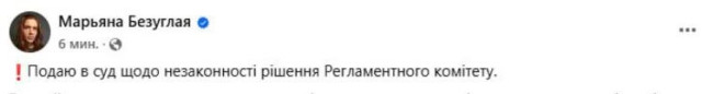 Мар’на Безугла, своєю чергою, повідомила у мережі, що подає до суду щодо рішення Регламентного комітету.«Нардеп Железняк написав, що я нібито перешкоджала діяльності народних депутатів, знімаючи засідання Парламенту в день, коли були офіційно дозволені прямі трансляції. Але щодо Гончаренка, який робить прямі трансляції вже роками, ні в кого немає питань. За те, що нібито ходила по залу з табличкою «Влада – це народ», що нібито перешкоджало колегам, але щодо блокувань трибуни, численних табличок і зривів засідань Парламенту з боку «Європейської солідарності» чи «Голосу» питань немає«, – написала вона.
