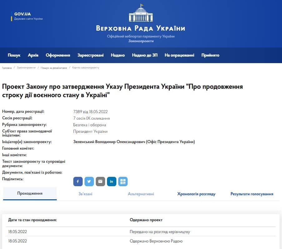 Проєкт закону № 7389 про затвердження указу президента «Про продовження строку дії воєнного стану в Україні» зареєстрований у парламенті 18 травня.