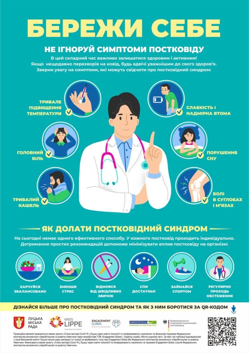 Створено постери А3 з інформацією про постковідний синдром, які розміщено у медичних закладах нашої громади.Також в межах проєкту було закуплено вітамінний імуностимулюючий чай для осіб похилого віку, які мали ускладнення внаслідок Covid-19 (1000 шт.). На упаковках чаю розміщено інформаційні наліпки.Загальний бюджет проєкту склав 50 000 євро. Грант було надано Федеральним міністерством економічної співпраці та розвитку Німеччини через некомерційне ТОВ «Engagement Global». Проєкт було реалізовано без співфінансування з бюджету громади.