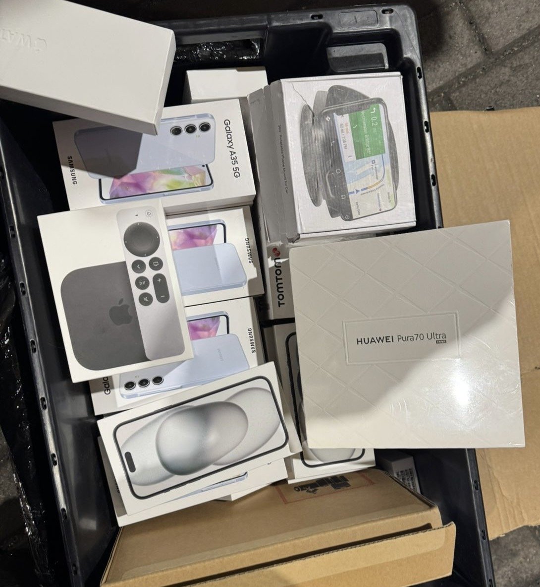 Загалом 78 мобільних телефонів, планшетів, смарт-годинників та аксесуарів до них містились у двох пластикових коробках, розміщених у багажному відділенні.