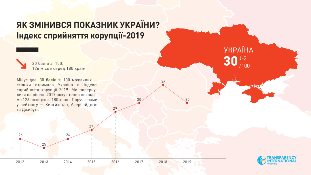 Організація Transparency International оприлюднила щорічний рейтинг індексу сприйняття корупції за 2019 рік. Україна отримала в ньому 30 балів зі 100 можливих і посіла 126 місце зі 180. Таким чином, позиція України погіршилась – у рейтингу за 2018 рік вона посідала 120 місце, інформує УНІАН.