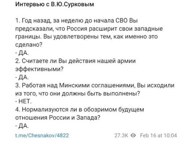 Також, Сурков відповів «Так» на питання про те, чи задоволений він «розширенням західних кордонів» Росії під час «СВО» і чи вважає дії російської армії ефективними.