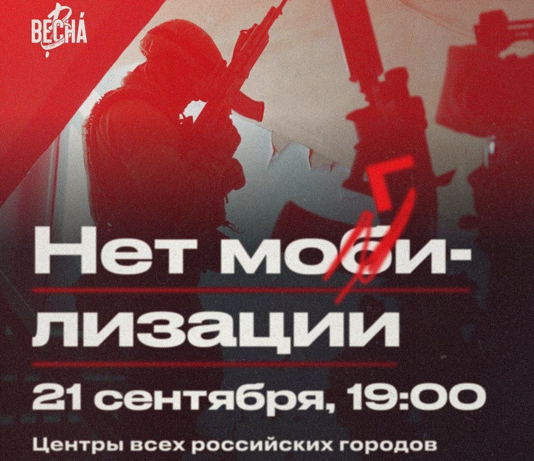Активісти руху «Весна» закликають росіян виходити на мітинги о 19:00 в центри своїх міст. Одне з гасел протесту – «Нет могилизации!»