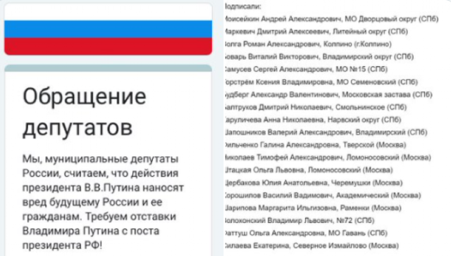 «Ми, муніципальні депутати Росії, вважаємо, що дії президента В.В. Путіна завдають шкоди майбутньому Росії та її громадянам. Вимагаємо відставки Володимира Путіна з поста президента РФ!» – сказано в заяві.Російська журналістка Олена Руковцева підтвердила інформацію і додала, що справа начебто йде до «Великої Жовтневої революції, яка знову буде з Пітера».