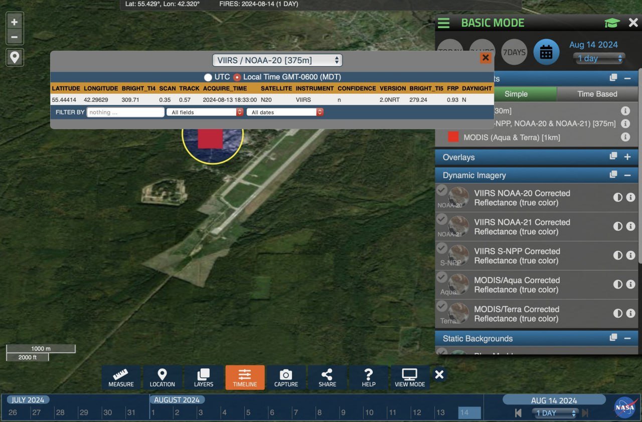 Зі скриншотів з FIRMS, супутникової системи фіксації пожеж від NASA, які показав OSINT-аналітик Neonhandrail, видно, що на аеродромі «Саваслейка» палає пожежа.