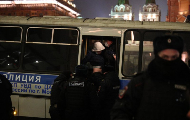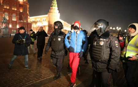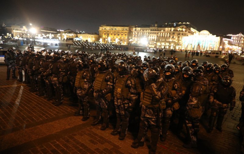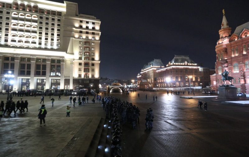 На Манежній площі Москви вже затримали сімох осіб. Поліцейські садять затриманих в автозаки. При цьому наголошується, що демонстранти були без плакатів.