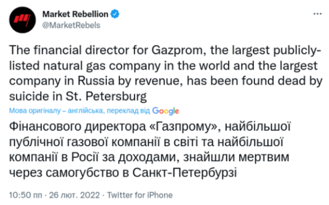 У російському селищі Ленінське у Ленінградській області виявили труп заступника гендиректора Єдиного розрахункового центру «Газпрому» з питань корпоративної безпеки. Чоловік повісився у гаражі-прибудові.