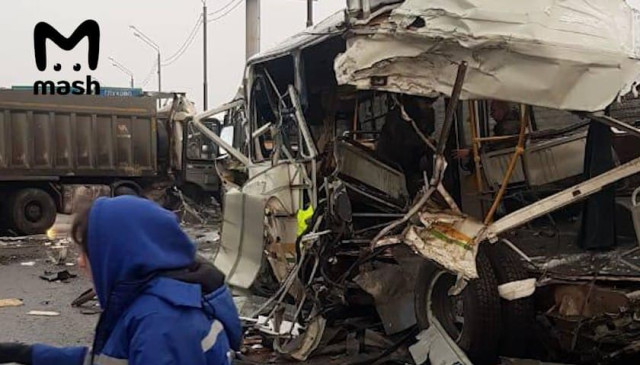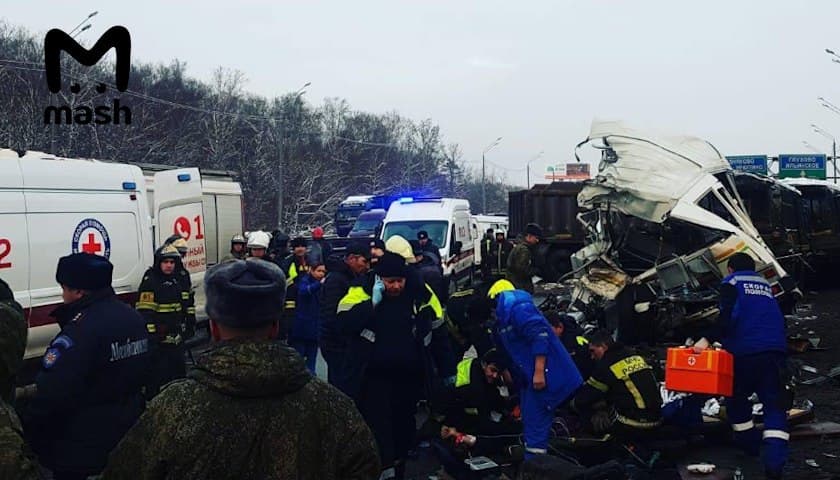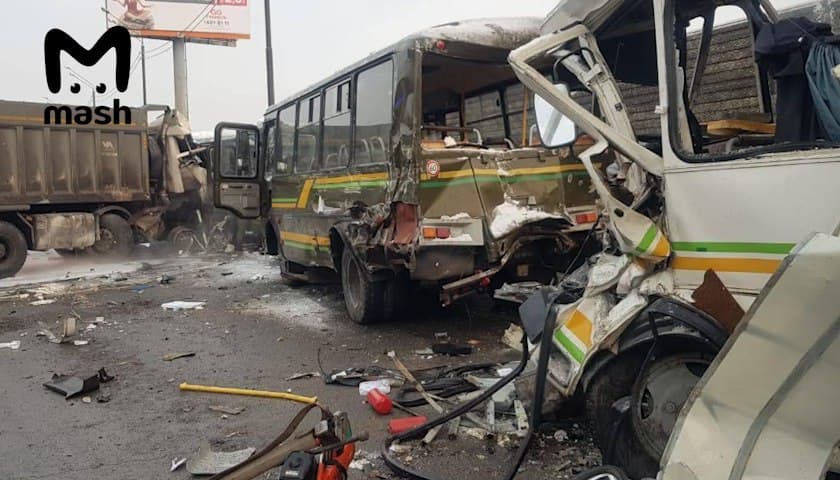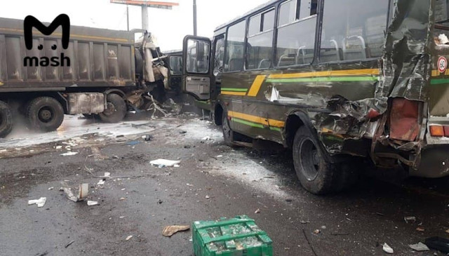 У Московській області на Новоризькому шосе самоскид протаранив колону військових автобусів.
