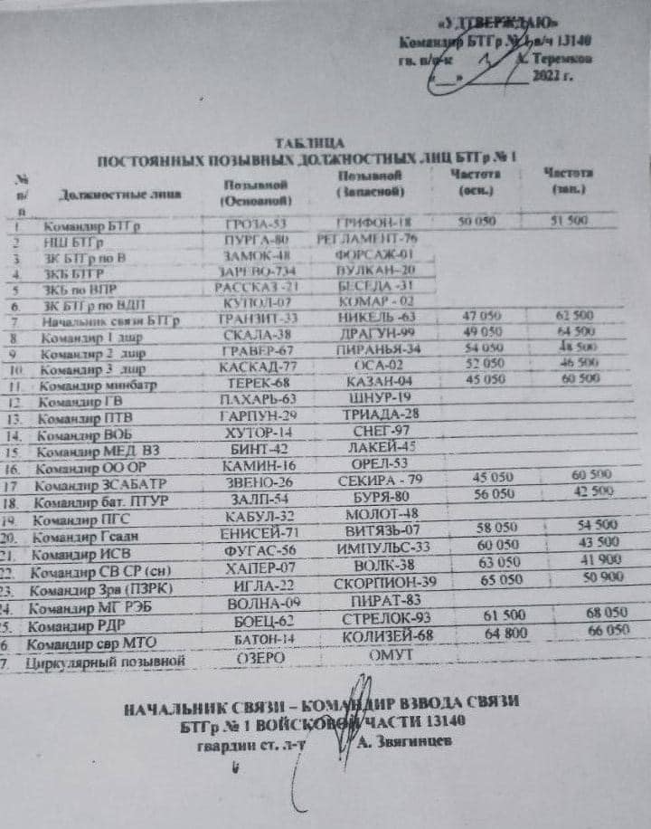 Серед отриманих документів робоча карта, бойове завдання, таблиця позивних, таблиці сигналів управління, таблиці скритого управління, список особового складу тощо.«Виходячи з отриманої інформації, відомо, що документи на війну з Україною були затвердженні ще 18.01.22 року, а сама операція із захоплення України мала пройти протягом 15 діб, а саме з 20.02. по 06.03.», – інформують у відомстві.