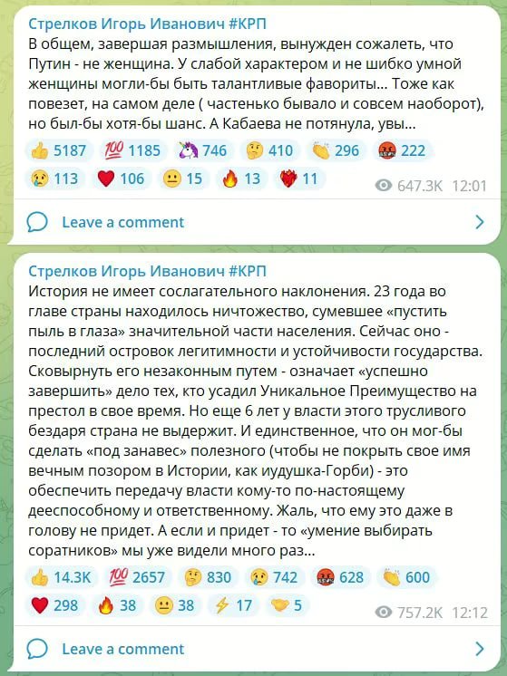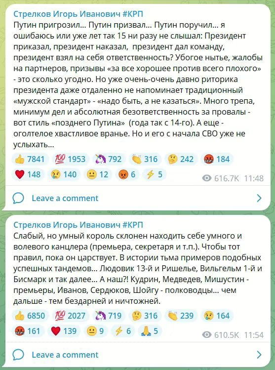 На думку Стрєлкова, Путіну слід «забезпечити передачу влади комусь по-справжньому дієздатному і відповідальному».Ігор Гіркін-«Стрєлков» – колишній ФСБшник, який у 2014 році брав активну участь у боях за Слов’янськ і в захопленні влади в Донецьку. Він яро підтримує війну, але критикує військово-політичне керівництво. 1 квітня 2023 року Гіркін-Стрєлков разом із Павлом Губарєвим і Максимом Калашниковим створив «Клуб розсерджених патріотів».