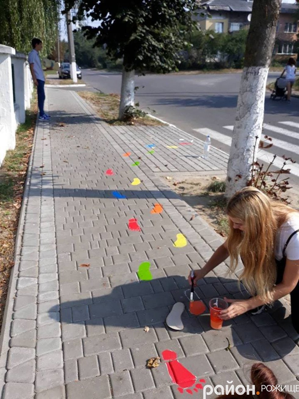 Рожищенські школярі намалювали ступні-вказівники, які ведуть від пішохідного переходу до школи.