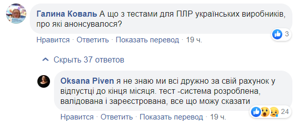 «Анонсовані тести приїхали, щоправда не для ПЛР-діагностики (полімеразно-ланцюгової реакції), а на антитіла. І не 10 млн, а 250 тисяч штук. Трохи не те, і трохи не так, помилився, з ким не буває, хотів приємне зробити народу. Зате 10 ШВЛ приїхали з Китаю! Ой, ні, не ШВЛ, а 11 ампліфікаторов (це спеціальні машини, щоб ПЛР проводити та виявляти присутність геному вірусу в пацієнтів)», – наголосила Півень.