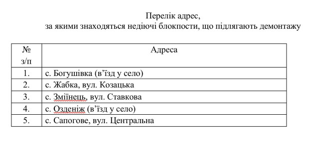 Із метою дотримання законодавства у сфері благоустрою та приведення до належного санітарного стану вулиць і доріг населених пунктів існує необхідність здійснити демонтаж таких блокпостів та прибрати узбіччя доріг від мішків з піском, бетонних блоків, старих автомобільних шин тощо. Реалізація цього рішення забезпечить належний естетичний вигляд вулиць і доріг громади.