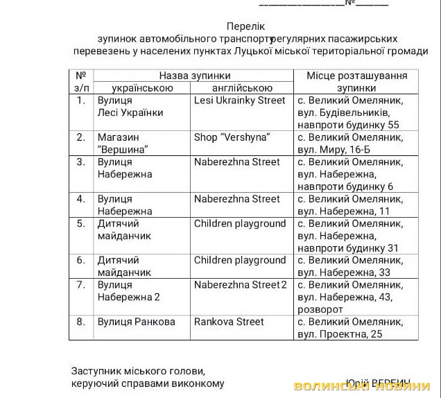 Затвердили перелік зупинок автомобільного транспорту регулярних пасажирських перевезень у селі Великий Омеляник.
