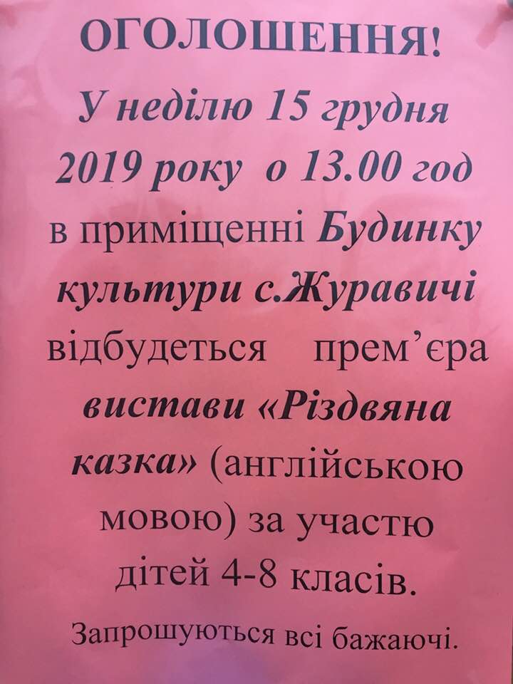 Напередодні свята Миколая у Журавичах Ківерцівського району відбулася неординарна подія. Учні місцевої школи подарували глядачам виставу англійською мовою. Оживити «Різдвяну казку» на сцені місцевого будинку культури допомогла журналістка і громадська діячка Олена Черенкова.