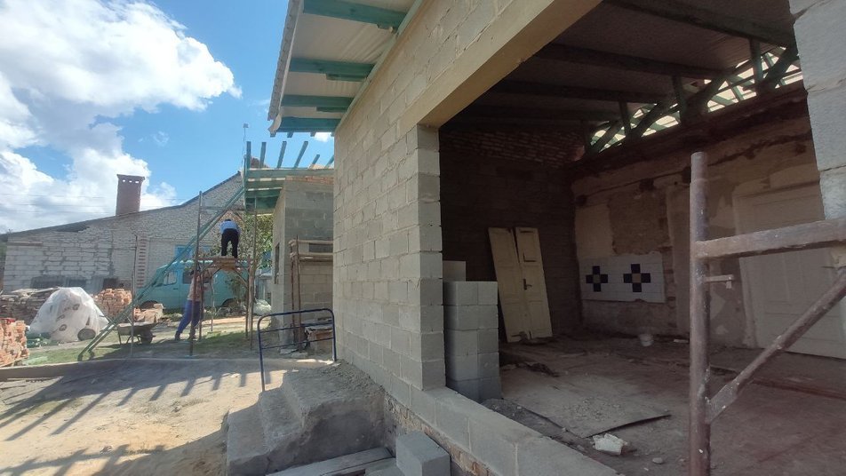 Як розповів сільський голова Роман Троцюк, з дня на день у селі чекають на надходження 200 тисяч із обласного бюджету. Їх теж витратять на відновлення будинку.Для відновлення зруйнованих стін використовують бетонні блоки