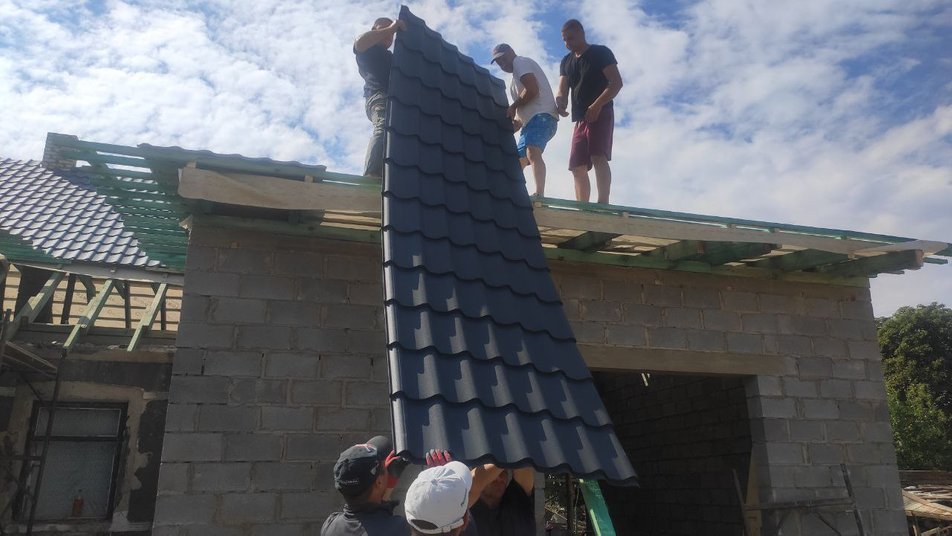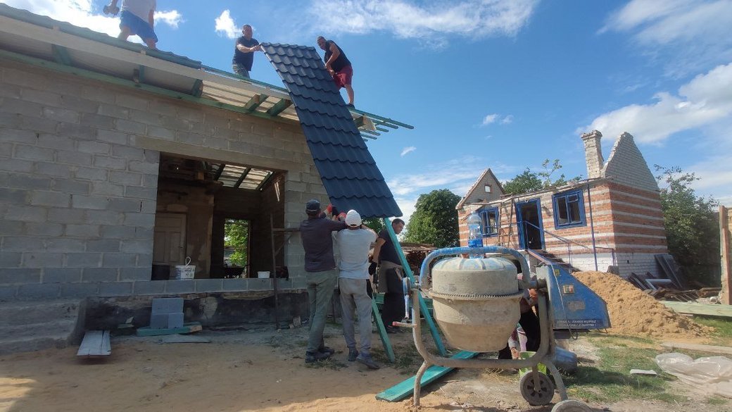 Нині чоловіки перекривають дах будинку. Покрівлю почали відновлювати кілька днів тому. Роботи вже майже завершили.Роботи на даху планують завершити з дня на день
