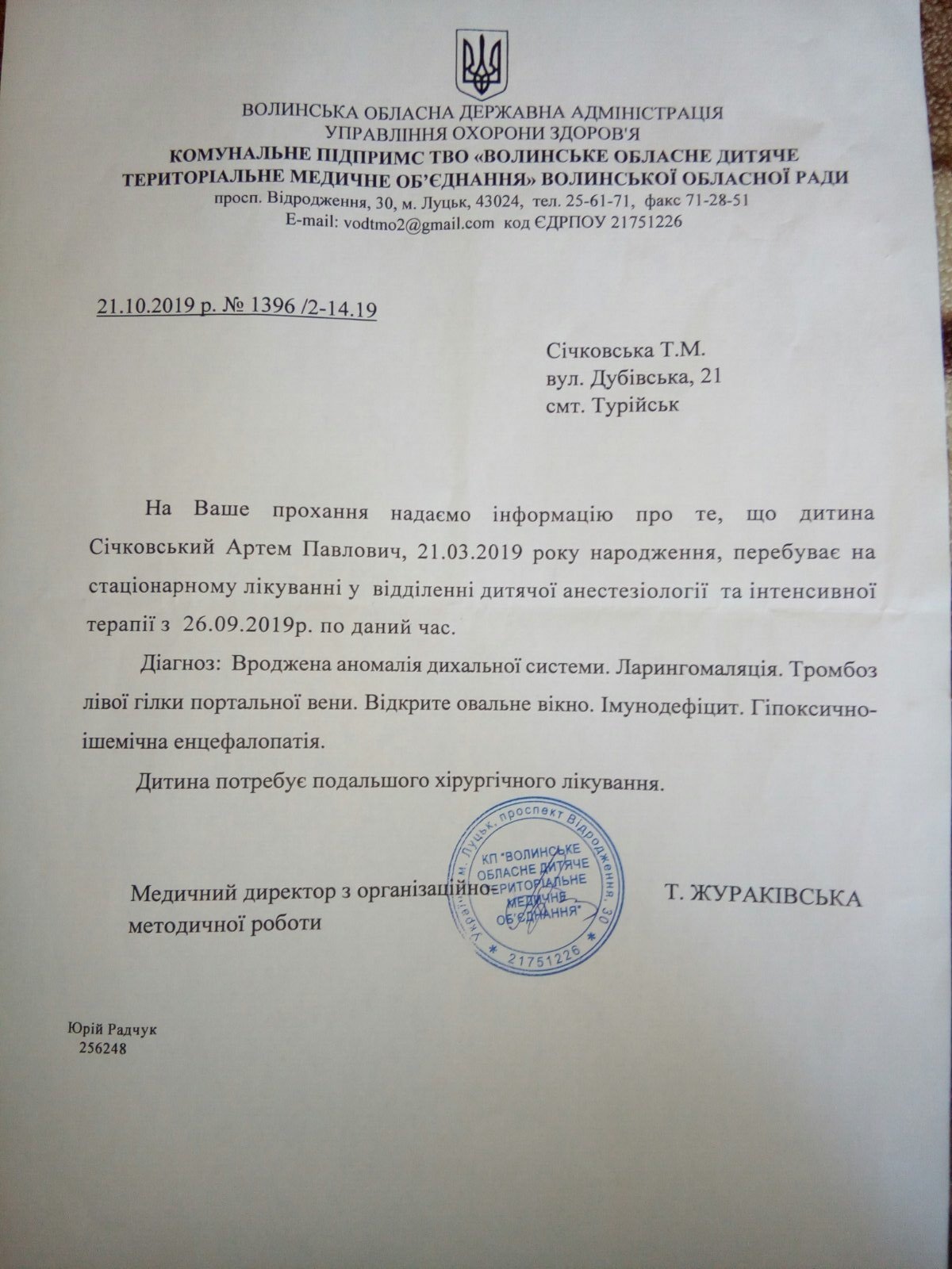 Артемку Січковському із Турійська – сім місяців. У дитини вроджена вада дихальних шляхів – синдром П’єра Робена. Хвороба досить рідкісна, зустрічається один випадок на 8,5 тисяч. Дитина не може самостійно дихати. За сім місяців дитина уже втретє в реанімації. Зараз Артем з мамою перебувають у Волинській обласній дитячій клінічній лікарні.