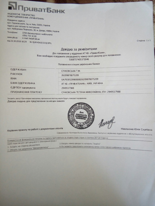 Реквізити для переказу коштів: картка Приватбанку 5168757405373046 Січковська Тетяна Миколаївна (мама Артема)
