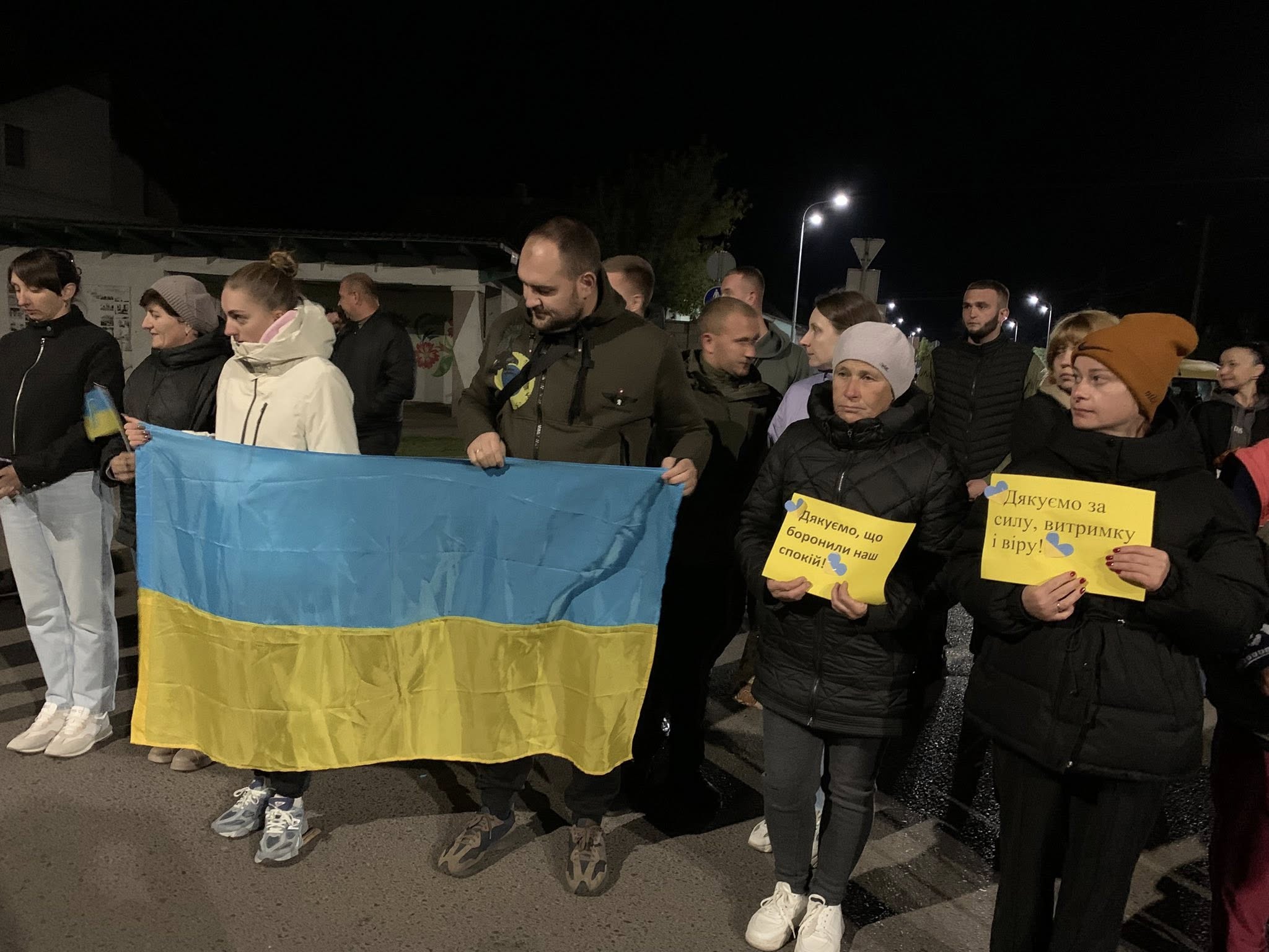 Плакатами з патріотичними написами, прапорами, квітами, вигуками «Вітаємо!» та оплесками вітали люди мужнього воїна на рідній землі, інформують у громаді.