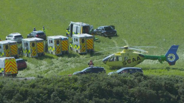 На місце інциденту прибули близько 30 машин, зокрема швидкої допомоги та рятувальної служби, а також один гвинтокрил.