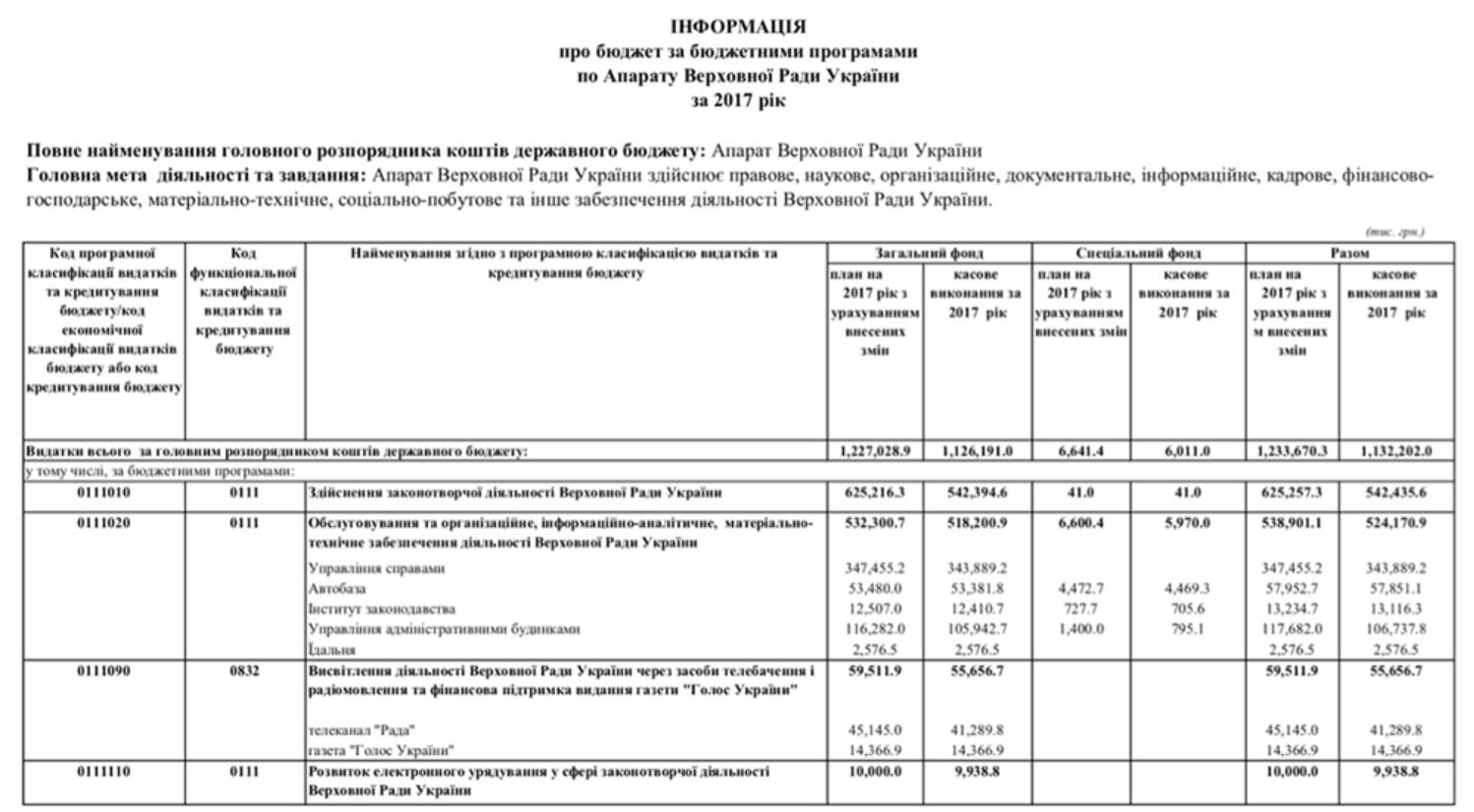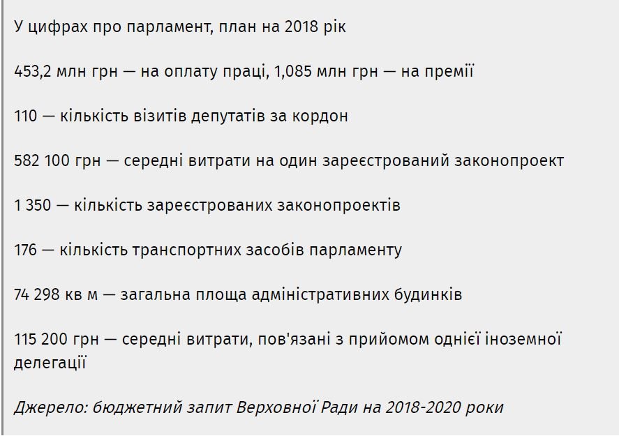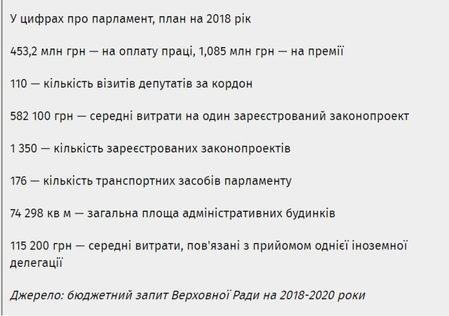 З неї можна зрозуміти, що на здійснення законотворчої діяльності у 2017 році держава витратила 542,4 млн грн, на утримання автобази — 57,8 млн грн, на управління будинками — 106,7 млн грн, на висвітлення діяльності депутатів через телеканал «Рада» і газету «Голос України» — 55,6 млн грн.