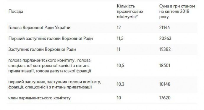 Посадові оклади народних депутатів визначаються у прожиткових мінімумах, установлених для працездатних осіб 1 січня відповідного року.