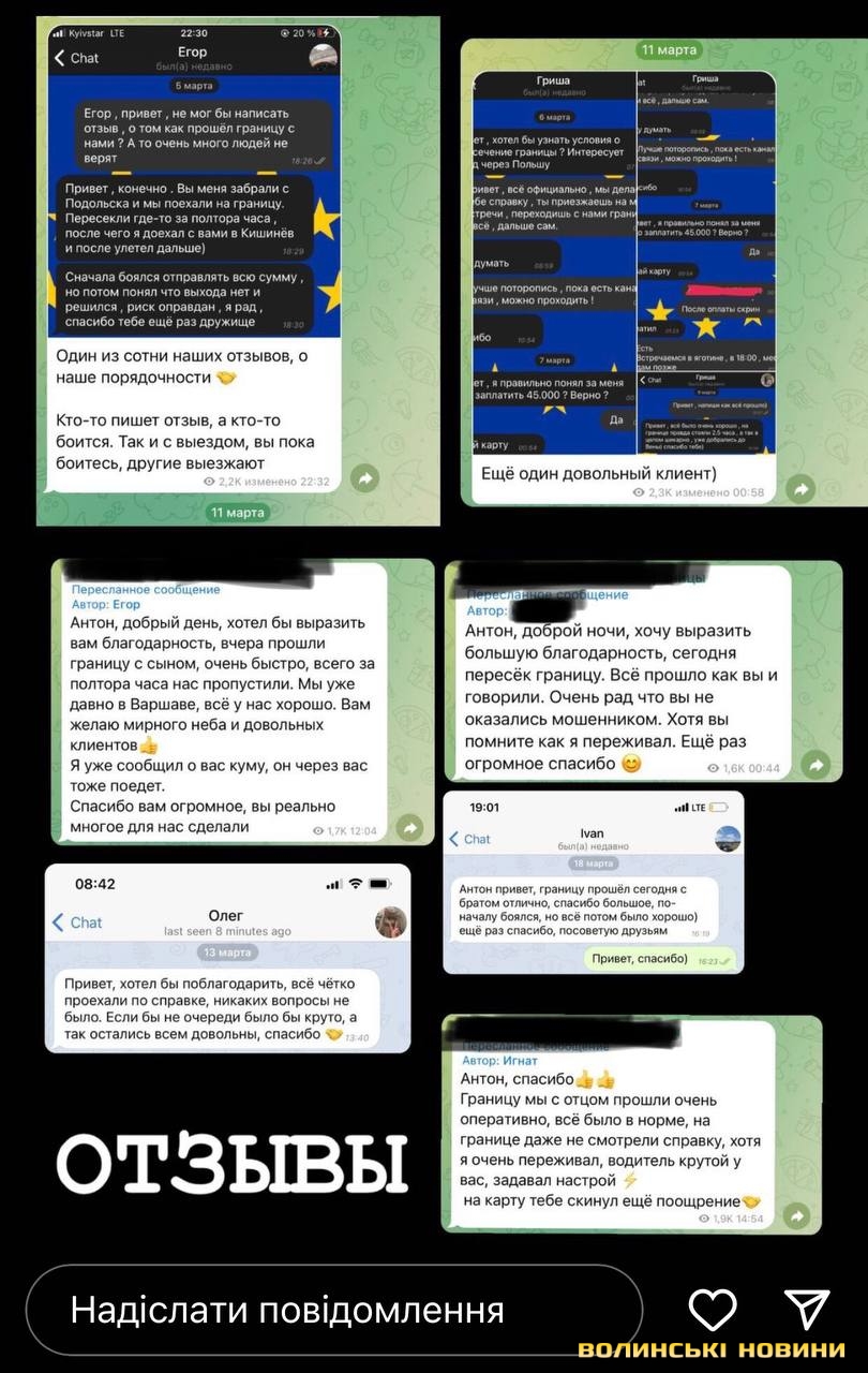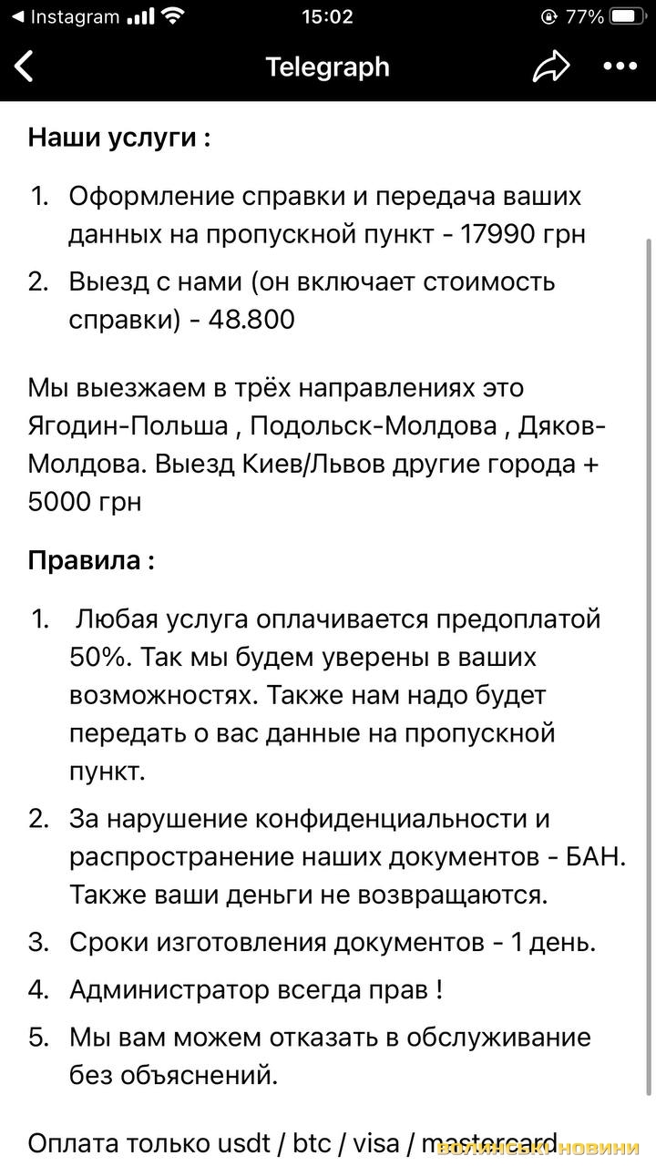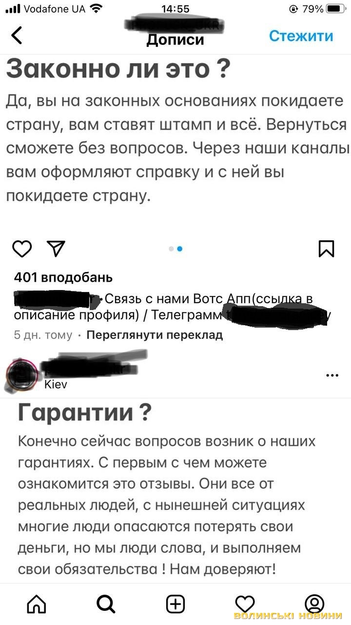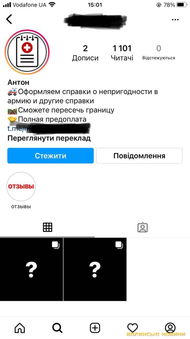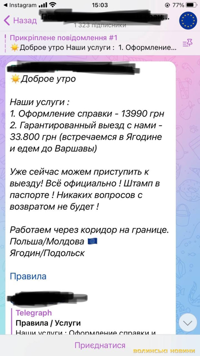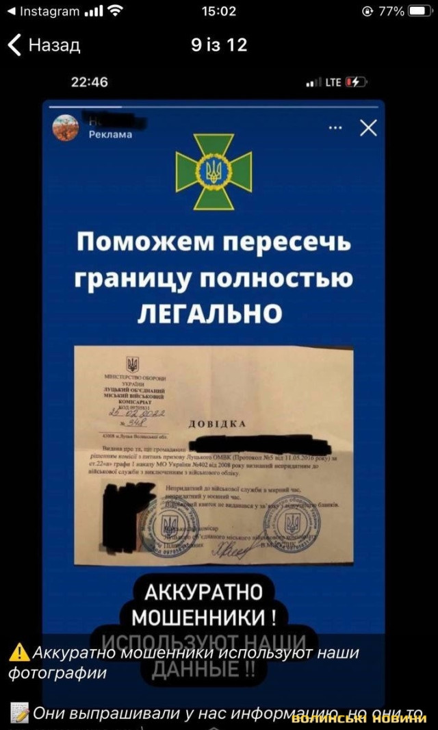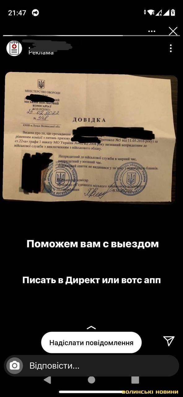 В Інстаграмі читачі Інформаційного агентства Волинські Новини помітили рекламні оголошення з пропозицією допомогти виїхати за кордон чоловікам призивного віку. У якості ілюстрації опублікована копія довідки про непридатність до військової служби за підписом військового комісара Луцького об’єднаного міського військового комісаріату.Зауважимо, автор сторінки з цією пропозицією, такий собі Антон, вказує геолокацію «Київ» і орієнтується не лише на Луцьк, а й на всю Україну.В оголошеннях він запевняє: завдяки цій довідці чоловіки на законних підставах перетинають державний кордон і повернутися вони зможуть без жодних питань. Як доказ – представлені відгуки «задоволених клієнтів». А ще тут же викривають «шахраїв», які користуються їхньою схемою.На сторінці є посилання на Телеграм-канал з розцінками та умовами такої послуги. Очевидно, автори вирішили навіть підняти розцінки, оскільки спершу йшлося, що довідка коштує 13 990 гривень, а потім її вартість зросла до 17 990 гривень. Також ділки пропонують вивезти власників довідок за кордон. За додаткову оплату. Вартість перевезення також подорожчала: з 33 800 гривень до 48 800.У довідках стоїть начебто підпис луцького військового комісара Василя Худика. Також нібито тут є й мокра печатка. Проте насправді цей документ – повна фікція, оскільки такої юридичної особи як Луцький об’єднаний міський військовий комісаріат вже давно не існує. Як і немає посади військового комісара.