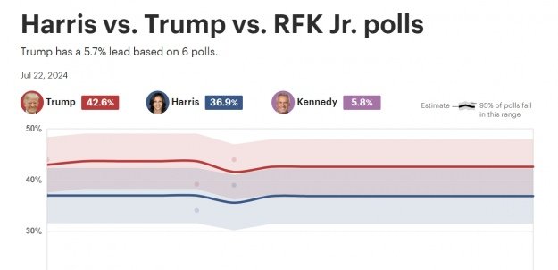 У разі включення в опитування незалежного кандидата Роберта Кеннеді відрив Трампа від Гарріс зростає до 5,7 процентних пунктів – приблизно 43% проти 37%, тоді як Кеннеді підтримали би майже 6%.