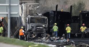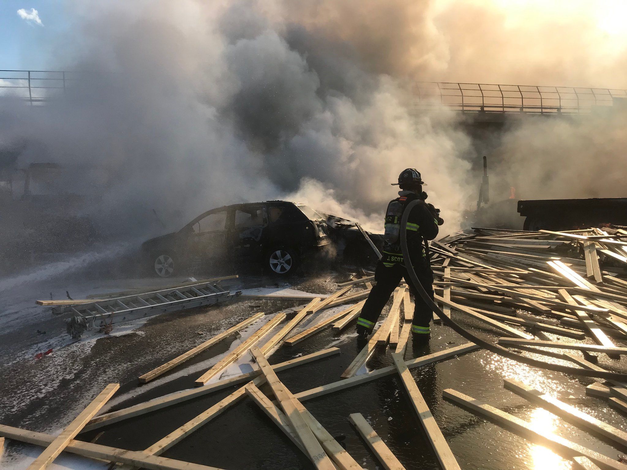 Повідомляється, що величезну аварію спровокувала фура з пиломатеріалами. На жвавій трасі вона на величезній швидкості врізалася в легковика попереду, після чого автомобілі охопило полум'я. Відзначається, що пожежу підживлювала деревина, яку перевозила фура.