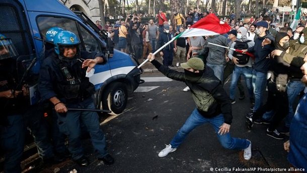 У Римі в суботу, 9 жовтня, тисячі людей вийшли на акцію протесту проти запровадження так званих «зелених паспортів» на робочих місцях у зв’язку з пандемією COVID-19. Під час протестів між поліцією та демонстрантами сталися сутички.