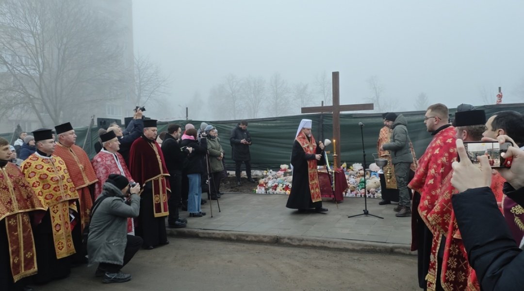 У Тернополі встановили та освятили пам’ятний хрест на вулиці Стуса поряд із місцем, де розташовувався будинок, зруйнований внаслідок атаки РФ 19 листопада.