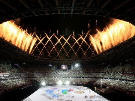 Над склепінням арени, трибуни якого залишилися порожніми через коронавірусні обмеження, прозвучав національний гімн Японії у виконанні незрячої співачки – і піднято прапор країни.