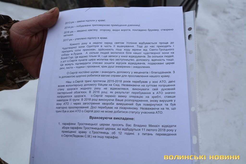Короткий зміст звернення: «Ми, парафіяни Тростянецької церкви з обуренням і нерозумінням сприйняли рішення про переведення нашого настоятеля о.Сергія (Ледвовка С.М.) на парафію с.Домашів і призначення нам священиком о. Василя (Довбуша В.А.), який має свою парафію в сусідньому селі Омельне. 4 лютого 2018 року більше 70 парафіян прийшли на службу та дізналися про те, що о.Сергій, який тільки 1 лютого повернувся з лікарні, переведений в іншу парафію. Люди були шоковані такими діями церковної влади.