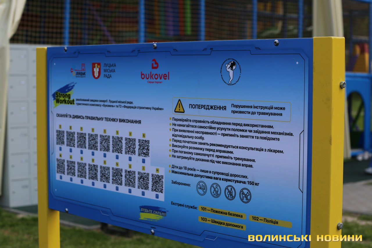 Президент Федерації стронгмену України Сергій Конюшок зазначив, що майданчик є повноцінним тренажерним залом просто неба і дає змогу виконувати вправи на різноманітні групи мʼязів.«Цей майданчик спеціально конструювали і розробили спеціалісти Федерації стронгмену України, а завдяки синергії і стратегічній співпраці з туристичним комплексом «Буковель цьогоріч ми реалізовуємо цей проєкт і встановлюємо такі майданчики в містах Івано-Франківської області, а сьогодні – в Луцьку», – наголосив Сергій Конюшок.
