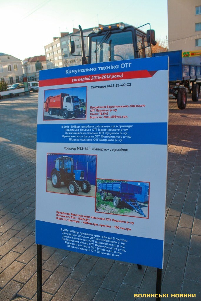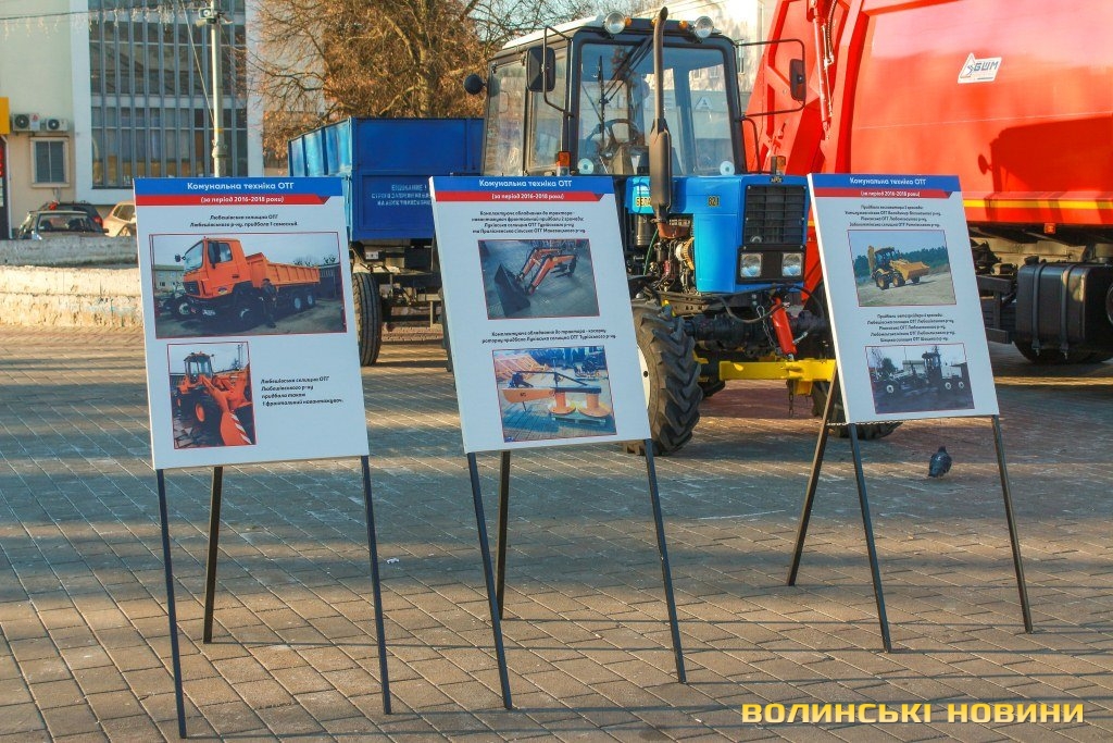 Зокрема тут можна було побачити комунальну техніку волинських ОТГ, придбану протягом 2016-2018 років. Так, Боратинська ОТГ придбала сміттєвоз вартістю 2,698 мільйона гривень та трактор «Беларус» з причіпом. Протягом трьох років сміттєвози купували також Павлівська, Княгининівська, Прилісненська та Шацька громади. Своєю чергою, під час засідання голова ОДА Олександр Савченко визнав, що «у Княгининівській громаді – Європа», зауваживши, що настільки подібних на Європу громад в Україні практично немає, за винятком міста Ірпінь, що на Київщині.