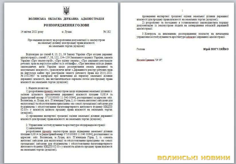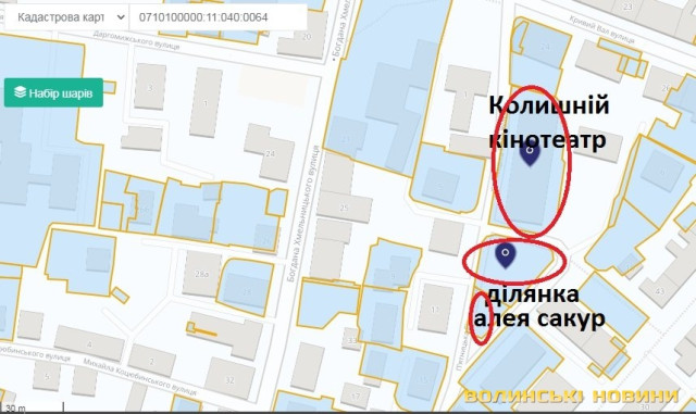 Зокрема, цим документом наданий дозвіл на розроблення проєкту землеустрою щодо відведення земельної ділянки державної власності у власність шляхом продажу права власності на земельних торгах (аукціоні). Йдеться про ділянку, площею 0,0814 га [кадастровий номер: 0710100000:11:040:0064], яка розташована за адресою: Волинська обл., м. Луцьк, вул. П’ятницька Гірка, 2.До слова, поруч розташоване приміщення колишнього кінотеатру «Батьківщина». З 1993 року там розміщувалась Волинська телерадіокомпанія. Наразі сама будівля перебуває у комунальній власності Луцької міської ради, інформують у відділі комунального майна міськради. Сама ж ділянка, яку готують до продажу, розташована обабіч, безпосередньо за Центром надання адміністративних послуг. Свого часу тут був міський фонтан, який згодом зруйнувався. У 2014 році тут планували звести капличку імені Героїв Небесної Сотні. Пізніше територію виклали бруківкою, встановили лавки, а згодом на прилеглій ділянці висадили сакури.Як повідомив директор КП «Парки і сквери міста Луцька» Богдан Феденчук, згадана територія, де висаджені сакури, не має офіційного статусу скверу міста, яким би опікувалося підприємство. Висадка на цьому місці сакур було міською ініціативою облагородити територію, реалізованою за кошти меценатів.